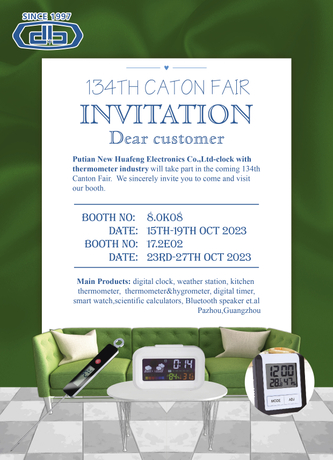 Putian New Huafeng Electronics Co.,Ltd-clock with thermometer industry will take part in the coming 134th Canton Fair. We sincerely invite you to come and visit our booth.